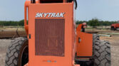 The 2014 JLG 8042 telehandler has 871 hours and is powered by a 3.261L Cummins QSB3.3 diesel engine with a Powershift transmission (4 forward, 4 reverse) and four-wheel drive. It features a canopy, crab and four-wheel steering, and a maximum lift capacity of 8,000 lbs with a 42′ lift height and 3-stage boom. The telehandler includes 48″ forks, auxiliary hydraulics, a tilt carriage, hydraulic leveling, and a manual quick attach. It is equipped with foam-filled 370/75-28 tires and an 8,000 lbs counterweight.